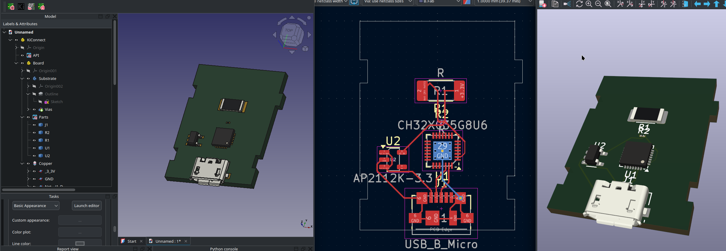screenshot of FreeCAD, KiCAD and KiCAD 3d View